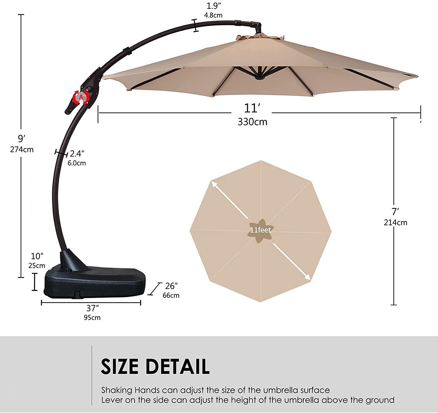 The entire patio offset umbrella frame is constructed of rust-free aluminum, from the sturdy aluminum pole to the 8 umbrella ribs. The canopy is also designed to last – it is made from water and fade resistant polyester fabric that is UV protected and double-coated with polyurethane for added durability.